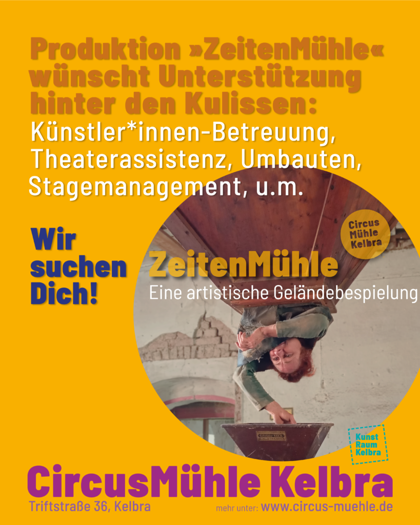 Im Rahmen der artistischen Geländebespielung ZeitenMühle auf dem Gelände der CircusMühle Kelbra, gibt es die Möglichkeit, hinter den Kulissen mit dabei zu sein! Etwa als Künstler*innenbetreuung, bei Umbauten oder im Stagemanagement.